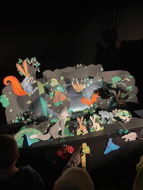 La Compagnie Najico a su conquérir le public en mettant en scène un immense livre pop-up s’ouvrant sur le décor d’une forêt mystérieuse, où 2 petits lapins mangent tranquillement. Vraiment tranquillement ? L’un d’eux s’inquiète : quels sont ces bruits étranges, ces yeux qui apparaissent dans les arbres, ces craquements ? C’est Loup, il en est sûr…