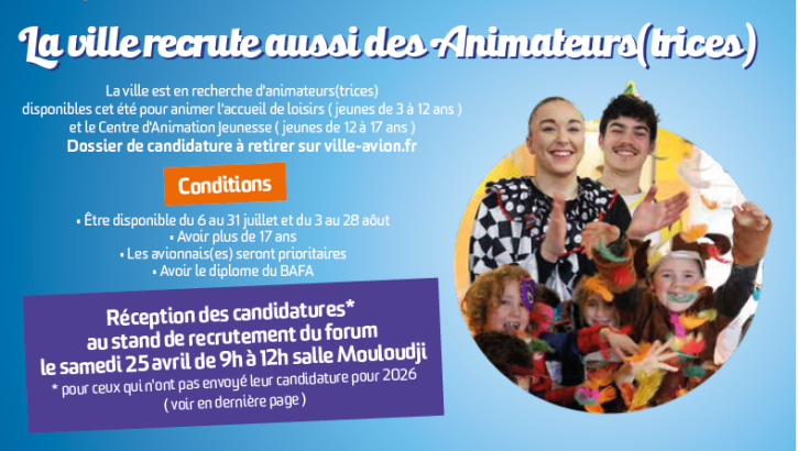 La ville recrute des animateurs pour ses centres de loisirs pendant les périodes de vacances scolaires Zoom sur l'image Pour postuler comme animateur pendant les vacances scolaires, veuillez remplir le dossier ci-dessus et le retourner complété en mairie. 2025-2026_dossier_unique_animateur_2025_2026.pdf Télécharger Taille: 89.19 Ko Extension: pdf Publié le 08 Avr. 2026